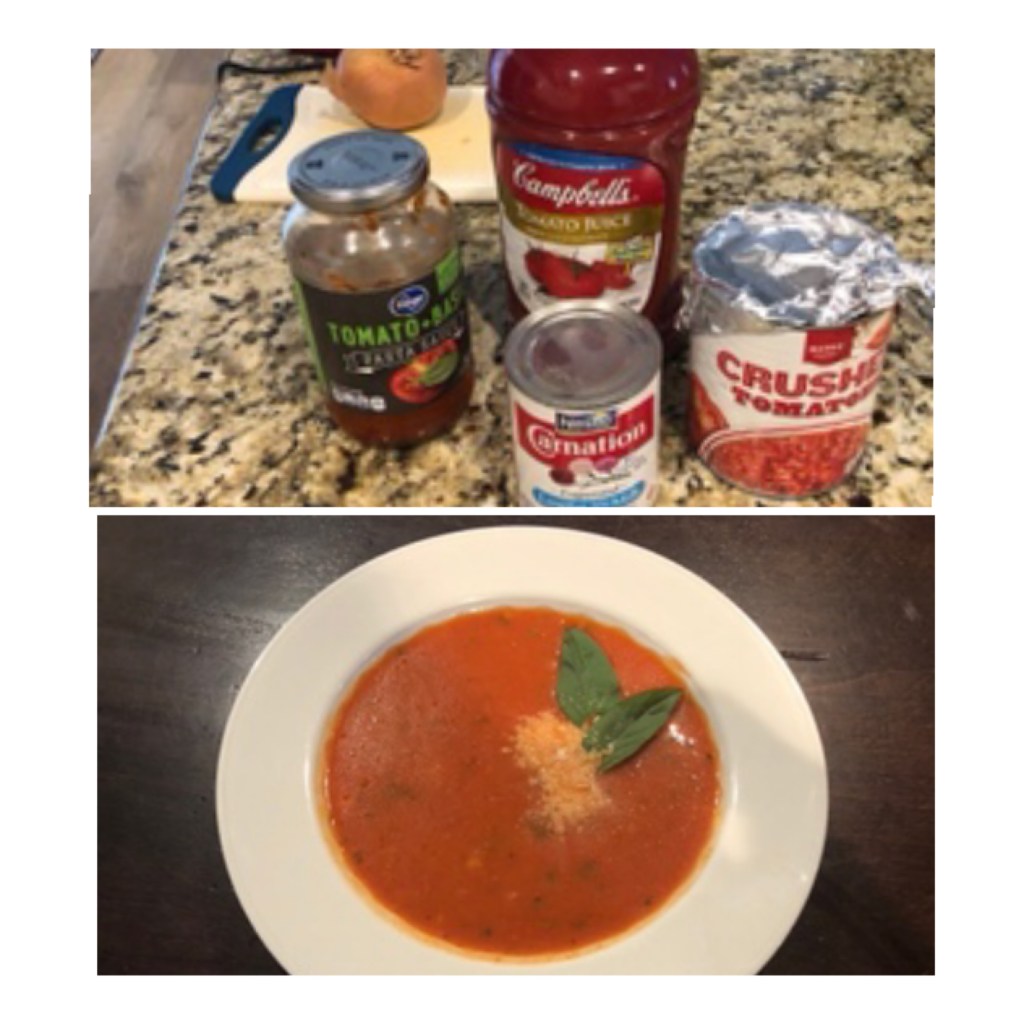 3-27-20 Kim V: A week without groceries… combining left-overs and pantry… Creamy tomato soup: tomato juice (exp 2019) from the bloody mary bar (not opened), evaporated milk, remainder of open tomato sauce and canned tomatoes…