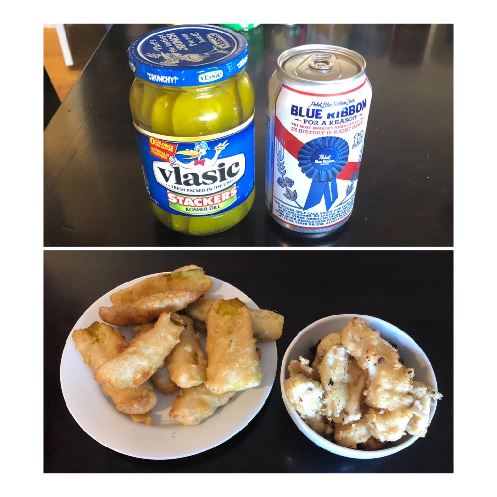 My beer batter was light and airy, and the fried pickles were almost as good as I’ve had at our favorite beer garden (again, I think refrigerated pickles would be an upgrade). I ended up with more batter than I needed, so we found some frozen cod in the freezer and defrosted and fried it up too. Not the healthiest dinner I’ve ever made, although honestly I can’t actually remember the last time I fried anything. I would give it 4 stars (the family said 5)…