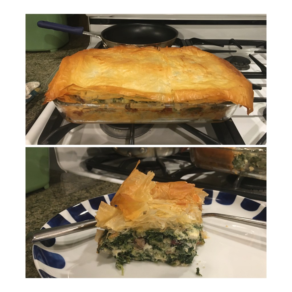 Robin T: Spinach pie. We had phyllo dough, breadcrumbs, nuts and spinach in the freezer. Did add the feta to the cart when we grocery shopped last weekend…