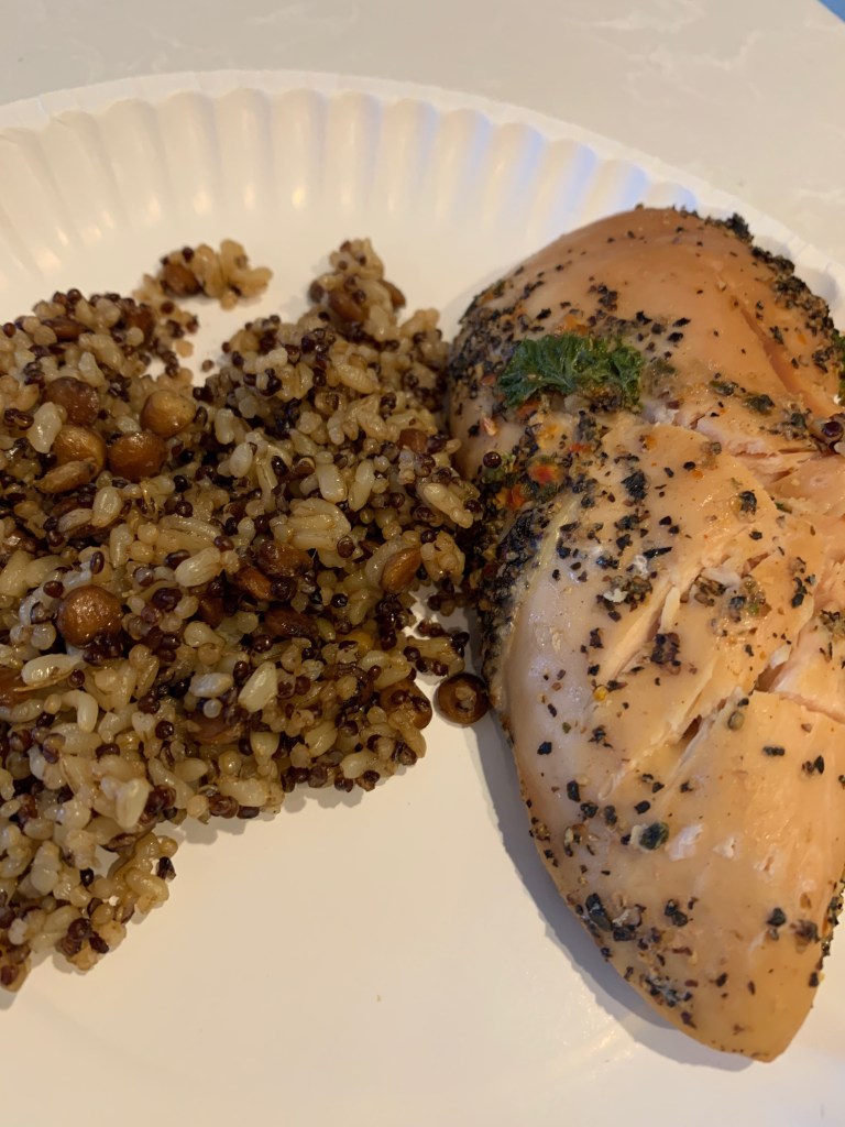 Peppered chicken breast with olive oil & sea salt quinoa, brown rice and lentils