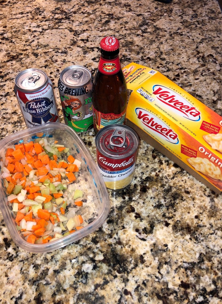 Beer cheese soup and bread ingredients