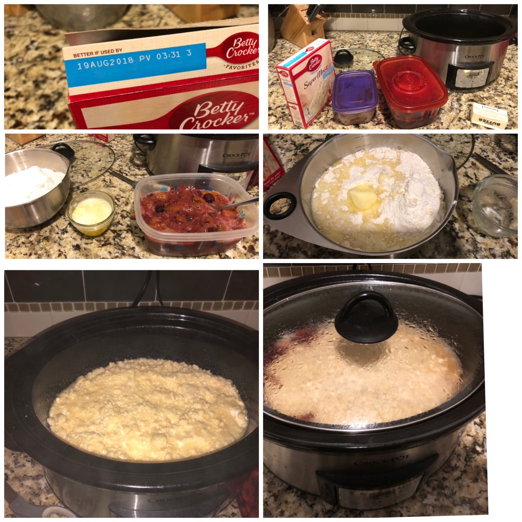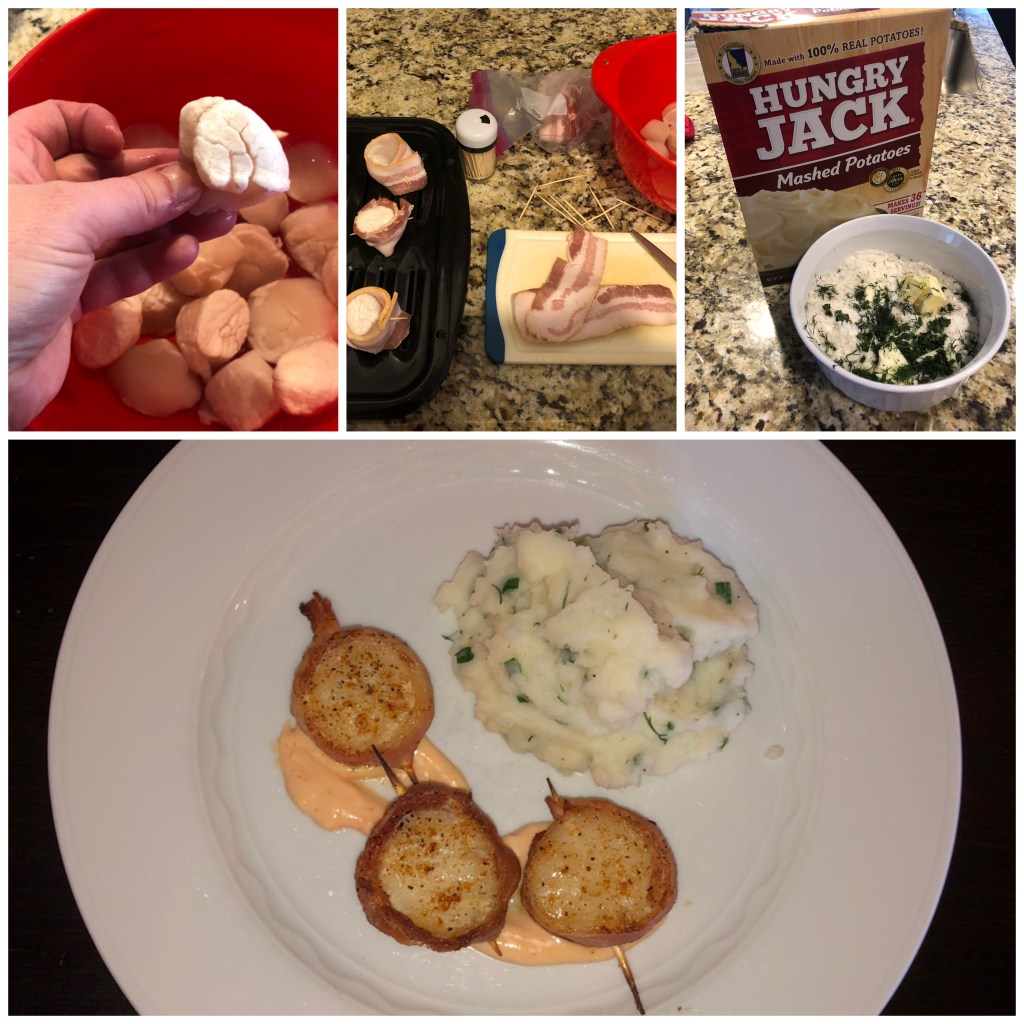 Hollie’s Hamburger Mac & Cheese and Pumpkin Spice Muffins fromfrom Zoom cooking nightPeach & Mandrin Kheer Pudding (see separate post for full details)Bacon Wrapped Freezer Burnt Scallops with Garlic Chive and Dill Rehydrated Mashed Potatoes3 Ingredient Peach-Blackberry Slow-Cooker Dump Cake (frozen fruit, expired cake mix, last stick of butter)