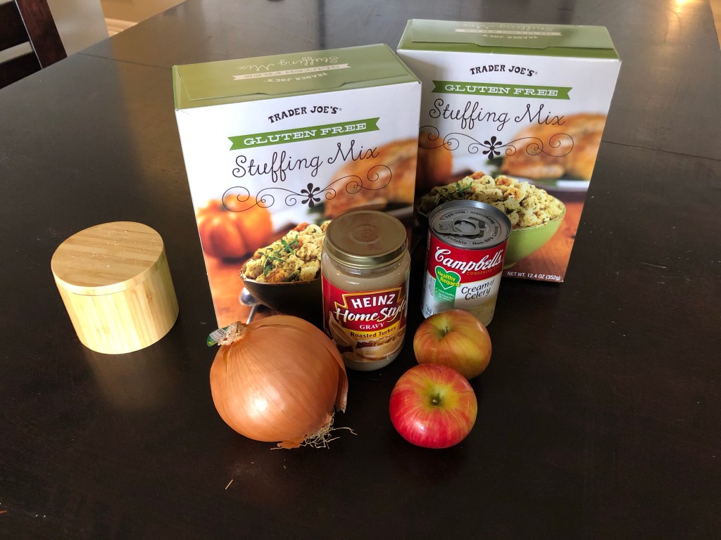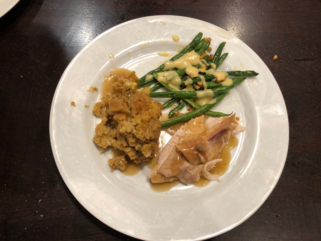 My late father-in-law and grandmother were children of the Great Depression and never threw ANYTHING away, expired or otherwise. John, my father-in-law, had an extensive collection of expired canned foods, condiments and unrecognizable leftovers that my family cleaned out of his apartment after his passing. Inspired by them, we used what we had to make a holiday-style dinner. We also used my Granny’s dressing recipe, which always makes me think of how resourceful and pragmatic she was. It is measured in soup cans rather than cups (see the separately posted recipe) and everything she made was from scratch, often without a recipe or formal measurements.