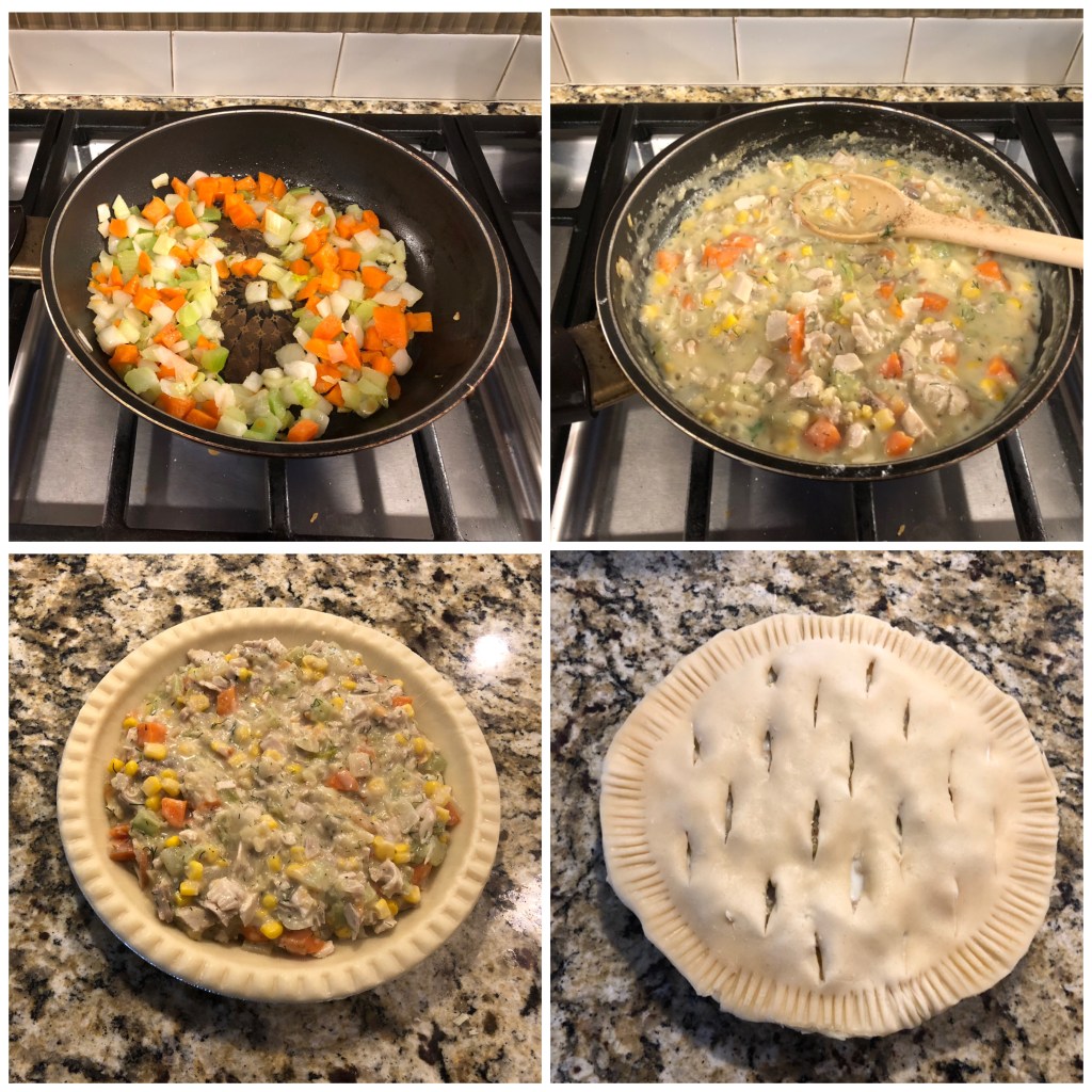 After finishing the green beans, we used the leftover Hollandaise on poached eggs at breakfast for the next two days. After running out of sandwich-worthy turkey, we took the smaller bits and combined them with carrots, onions & celery bits with a frozen pie crust and made a savory turkey pie…