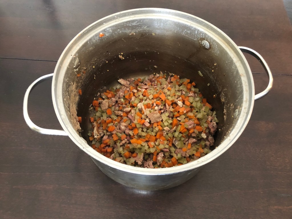 Huge mistake! There was a horrible aftertaste from the corned beef that did not make for a good broth. It was inedible. I tried to think if I could doctor it, and finally decided there was no fixing it. I left it in the fridge for a few days before discarding, especially disappointed to loose my precious “stone soup” bits (my freezer is now empty of such treasures). I decided to strain the bits, discard the broth, and regroup.