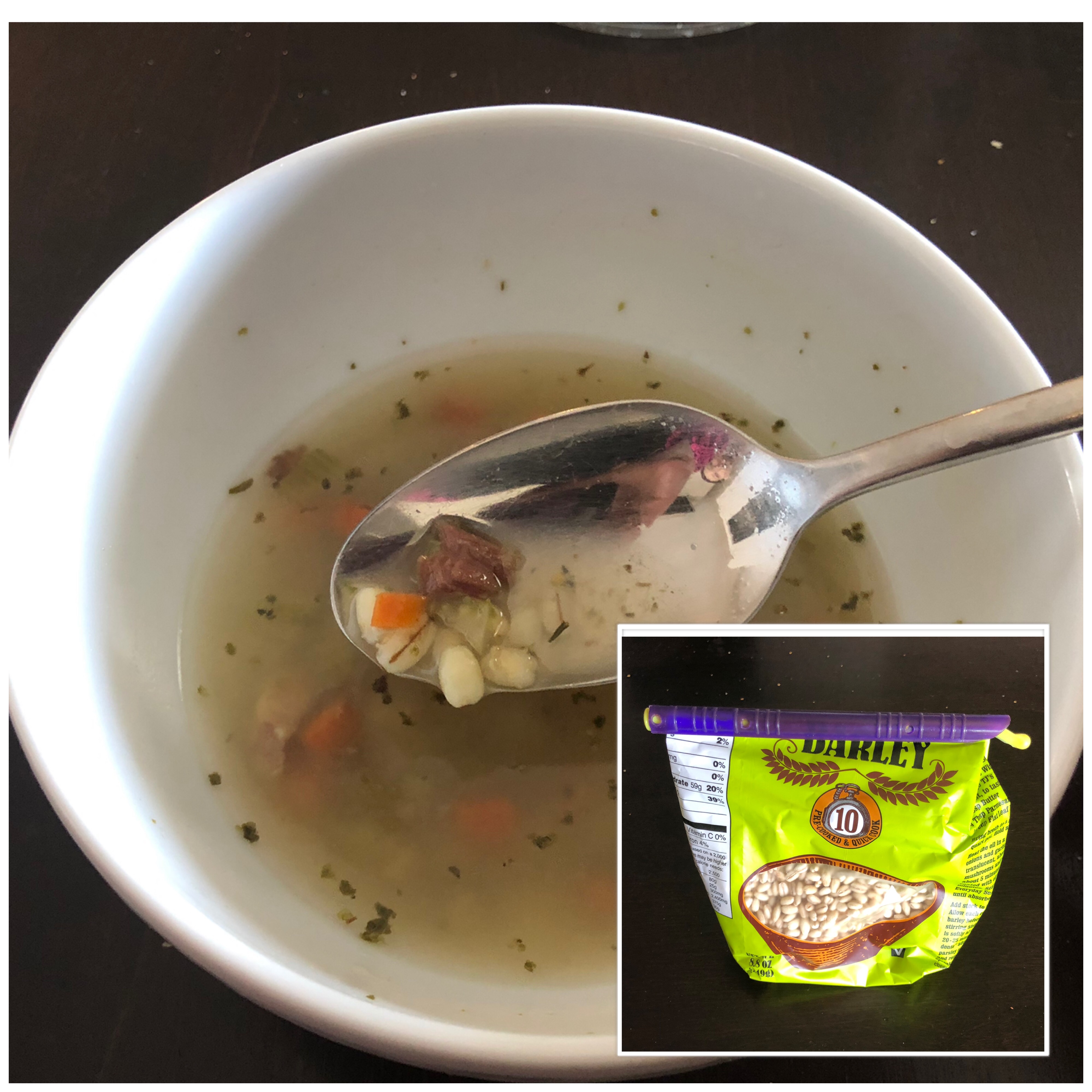I tasted the bits – they were okay (definitely edible outside of the corned beef broth). So, I started over with a new pot of water and bullion, added the meat and veggies, and retasted. There was still a hint of an aftertaste, so I threw in some dried Italian seasoning (Oregano is such a strong herb – it did the trick). Not my best soup, but serve-worthy. Also threw in the remains of a bag of barley…